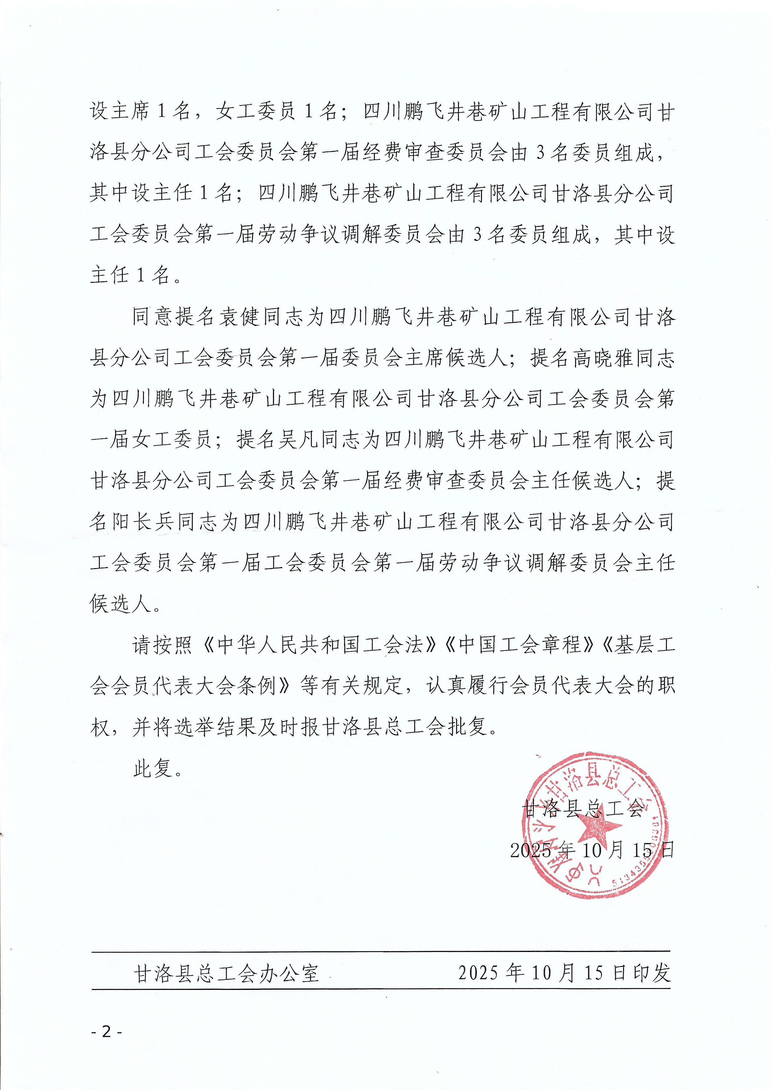 四川鹏飞甘洛县分公司工会批复成立
