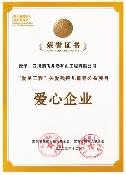 12月10日,四川省残疾人福利基金会、宜宾市残疾人联合会向四川鹏飞井巷矿山工程有限公司颁发“爱心企业”荣誉证书,对公司在“爱星工程”关爱残疾儿童等公益项目所作的贡献给予褒奖并表示感谢。“四川爱星工程”是由四川省残疾人联合会、四川省残疾人福利基金会等...